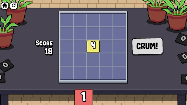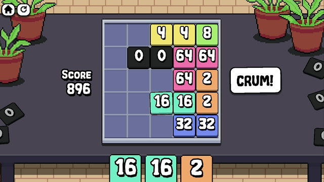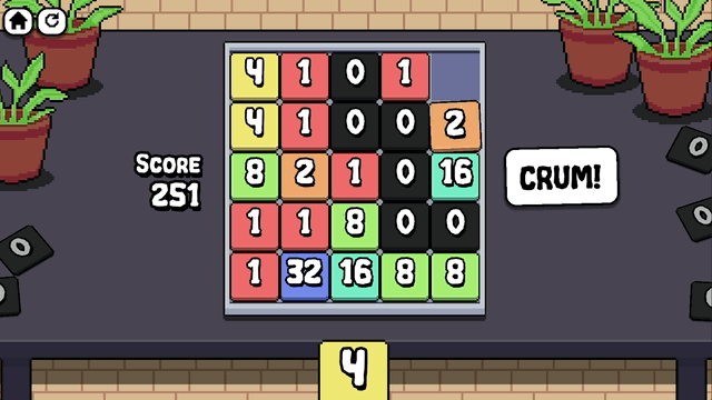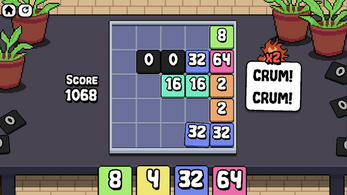 "Num Crum Match" is an arcade spatial puzzle game about numbers, crumbling, and matching. Numbers are repeatedly broken down by half until they reach 0. Place the numbers strategically to block or direct the crumbling and score higher!